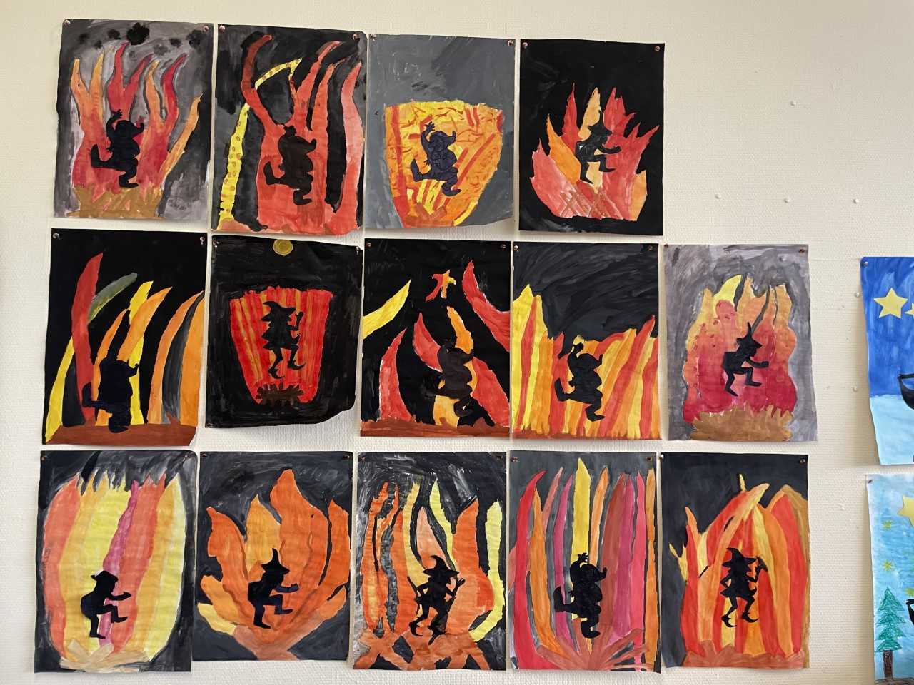 Die erste Anweisung war, zu den Märchen Rumpelstilzchen und Sterntaler ein Bild mit Wasserfarben zu malen. Hierbei wurden auf die hauptsächlichen Kennzeichen des jeweiligen Märchens der Schwerpunkt gelegt: das Mädchen, das Sterne sammelt und das Rumpelstilzchen, das um das Lagerfeuer tanzt.