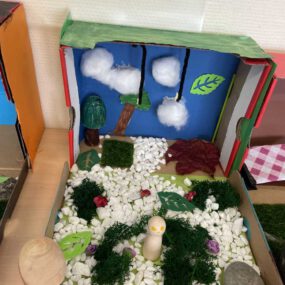 Die Ergebnisse der Klasse 5b der Schule am Mainbogen können sich sehen lassen. Alle Schülerinnen und Schüler haben sich sehr große Mühe gegeben und kreative Märchenkisten kreiert. Turm von Rapunzel, Hexenhaus aus Süßigkeiten von Hänsel und Gretel, Lagerfeuer von Rapunzel sind nur einige der großartigen Details, womit die Kinder ihre Kisten gestalteten.
